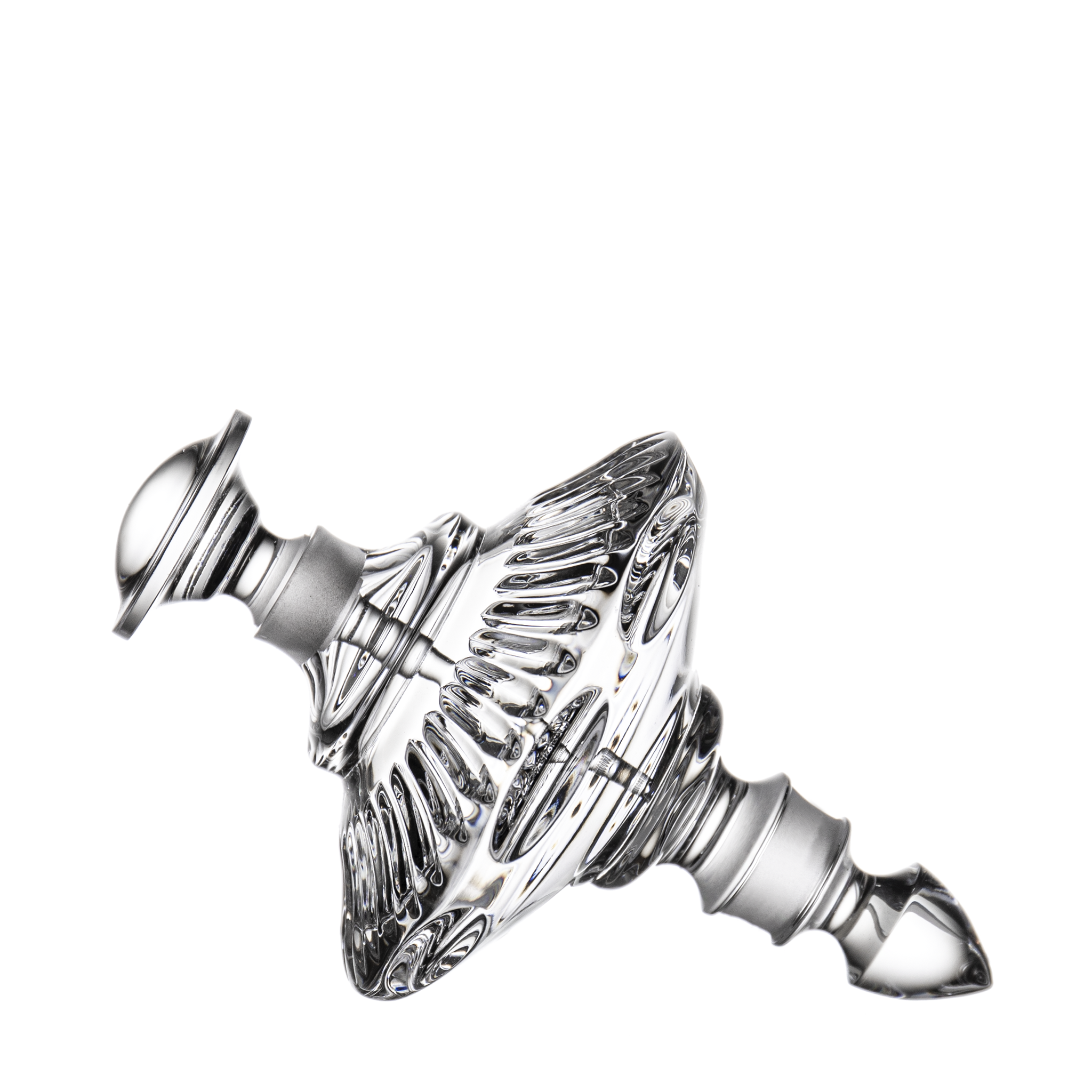An elegant clear toupie-style perfume bottle, showcasing Ajka’s signature crystal craftsmanship. Its sleek, rounded form and flawless clarity highlight both artistry and functionality, making it a timeless addition to any perfume collection or a striking decorative accent.