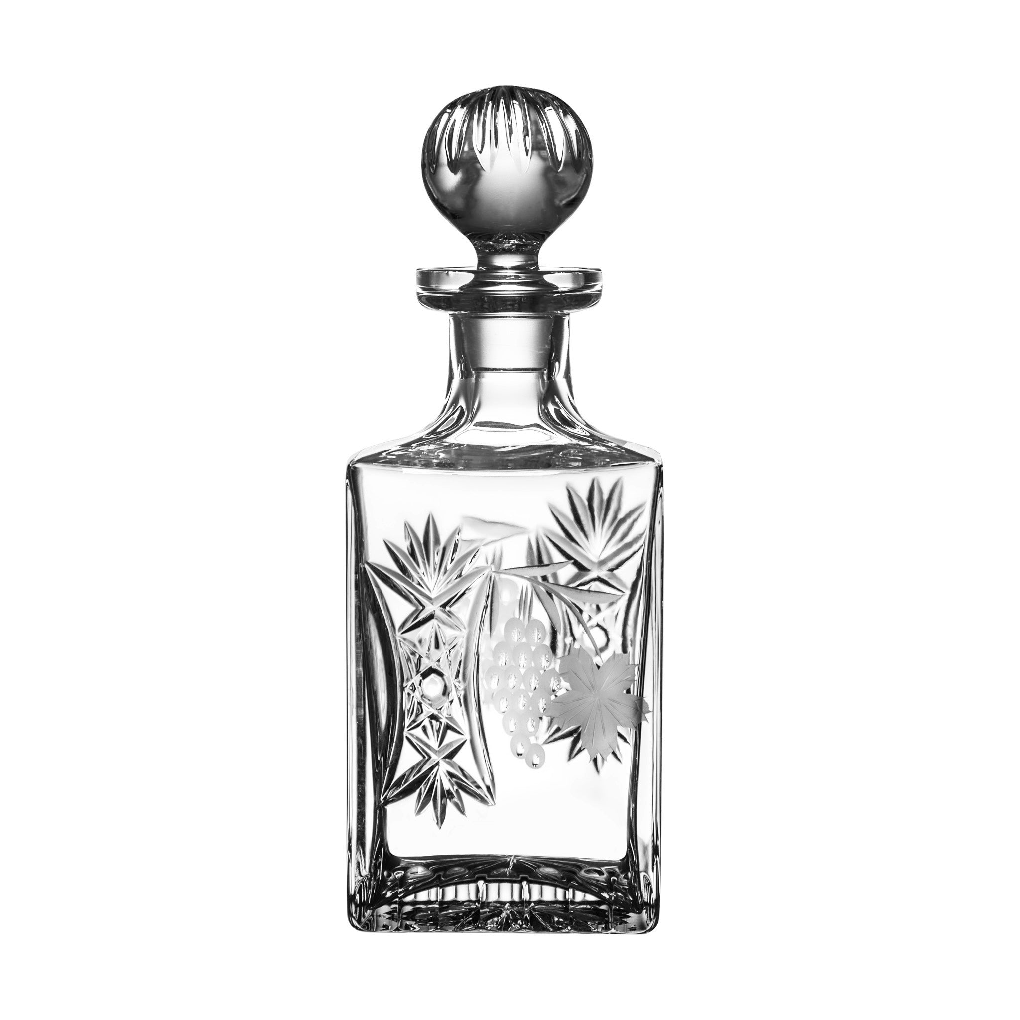 Introducing the lead crystal decanter from the Marsala collection - a timeless piece that embodies elegance and sophistication. With intricate grape leaf etchings and a unique design, this decanter is sure to impress any wine connoisseur. The wide base of the decanter allows for optimal aeration, ensuring that your wine is served at its best. The sleek, slender silhouette of the decanter makes it the perfect statement piece for any dinner party or special occasion. Whether you're a collector of fine glassware or simply enjoy a good bottle of wine, the Marsala collection's lead crystal decanter is the perfect accessory to showcase your vintage in style.