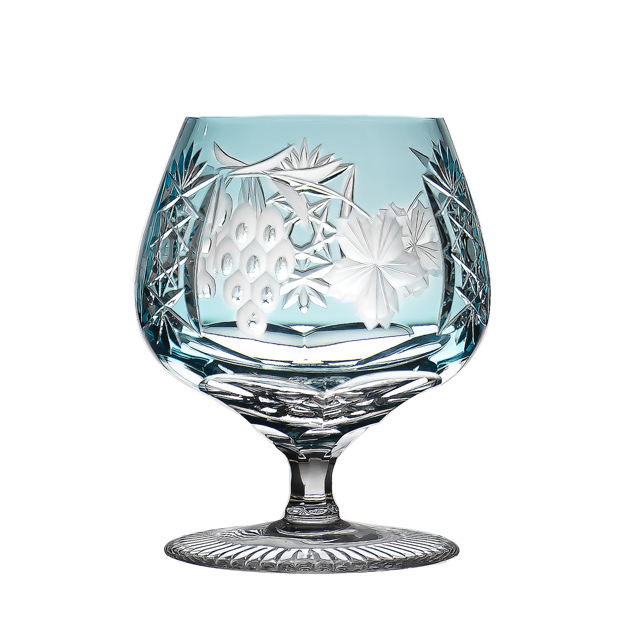 Taste your favourite drink from the world-famous Ajka Crystal collection named Marsala. You can always lend yourself elegance and luxury with this very rare, cased coloured lead crystal which is mouth-blown and handmade. Brandy glass decorated with wonderful grapes and leaves in very rare light blue colour.